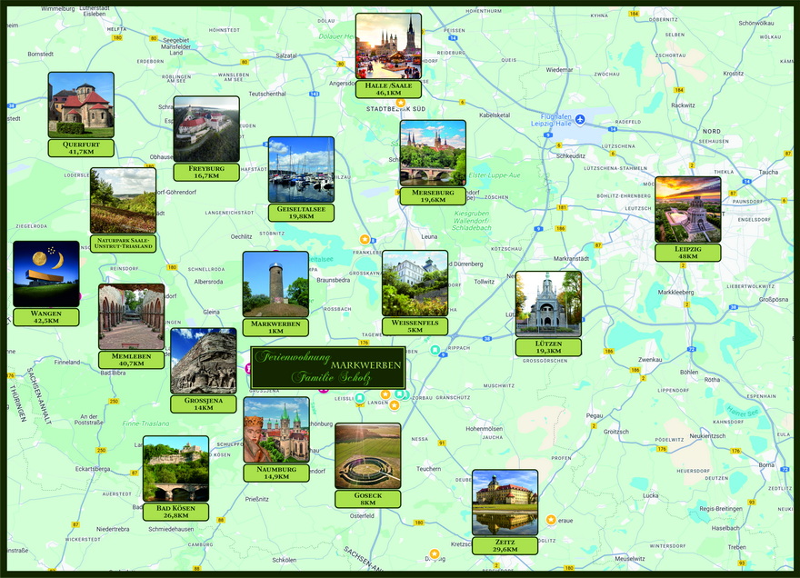 Die Saale-Unstrut-Region, der Burgenlandkreis und ganz Sachsen-Anhalt sind reich an kulturellen Highlights, Naturschönheiten und Orten mit einer wunderbaren und faszinierenden Geschichte. Viele sind weit über die Landesgrenzen bekannt oder zählen sogar zum Weltkulturerbe, andere gelten noch als Geheimtipp und warten darauf entdeckt zu werden. Auch wenn man in einer Woche nur einen Bruchteil der fantastischen Sehenswürdigkeiten erkunden kann wollen wir hier doch ein paar Anregungen geben - ein zweiter Besuch lohnt sich immer... (in Klammern immer die Entfernung von unserer Ferienwohnung) |