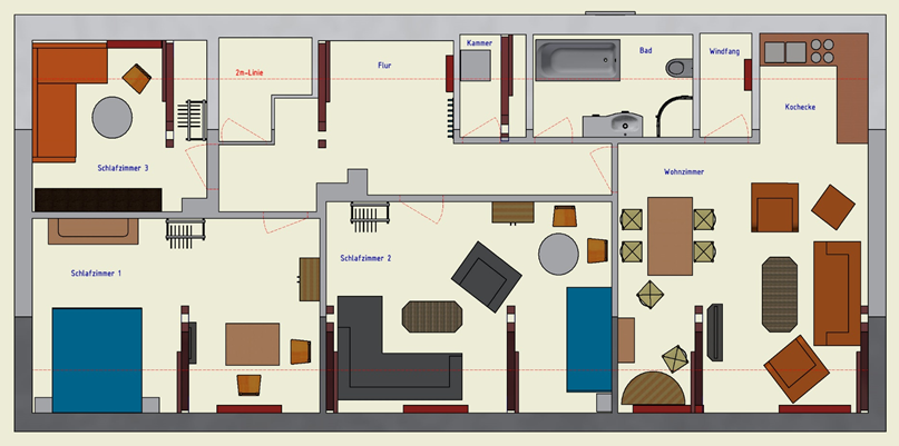 Die Wohnung kann mit Schlafzimmer 1 für 2 Personen zum Preis von 80,00€ / Nacht gemietet werden und hat dann ca. 65m². Alternativ steht die komplette Ferienwohnung mit ca. 96m² zum Preis von 110,00€ für 3-6 Personen zur Verfügung. Dazu kommen die Endreinigung für 40,00€ und bei Bedarf Handtücher und Bettwäsche für 10,00€ / Person. |